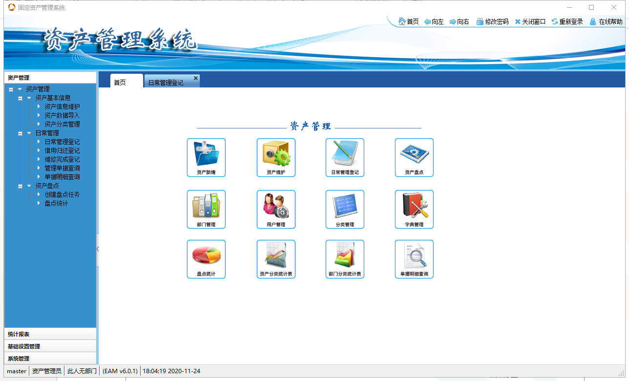 固定资产管理系统软件覆盖了固定资产的日常繁杂的管理、统计、盘点等方方面面工作,通过国际成熟的条形码技术对固定资产实物从登记、转移、调拨,退出,资产的运行、借用、盘点、报废等方面进行全方位准确监管,结合资产的统计等详细报表,真正实现"帐、卡、物"相符。系统中主要有以下功能: